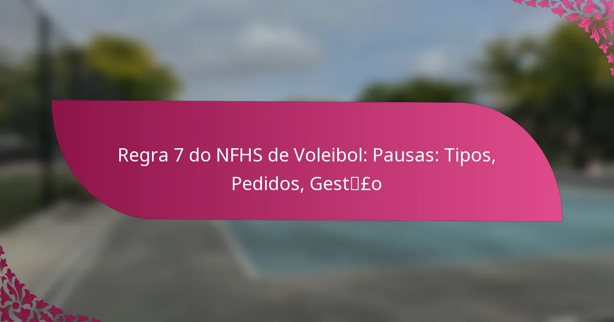A Regra 7 da NFHS fornece diretrizes abrangentes para a gestão de timeouts no voleibol, incluindo os seus tipos e as responsabilidades dos jogadores e oficiais. Os timeouts são essenciais para as equipas se reorganizarem, elaborarem estratégias e abordarem a fadiga dos jogadores. Existem três tipos principais de timeouts – de equipa, oficiais e de lesão – cada um com regras específicas que influenciam a dinâmica do jogo. Familiarizar-se com os procedimentos para solicitar e gerir estes timeouts é crucial para um jogo eficaz.